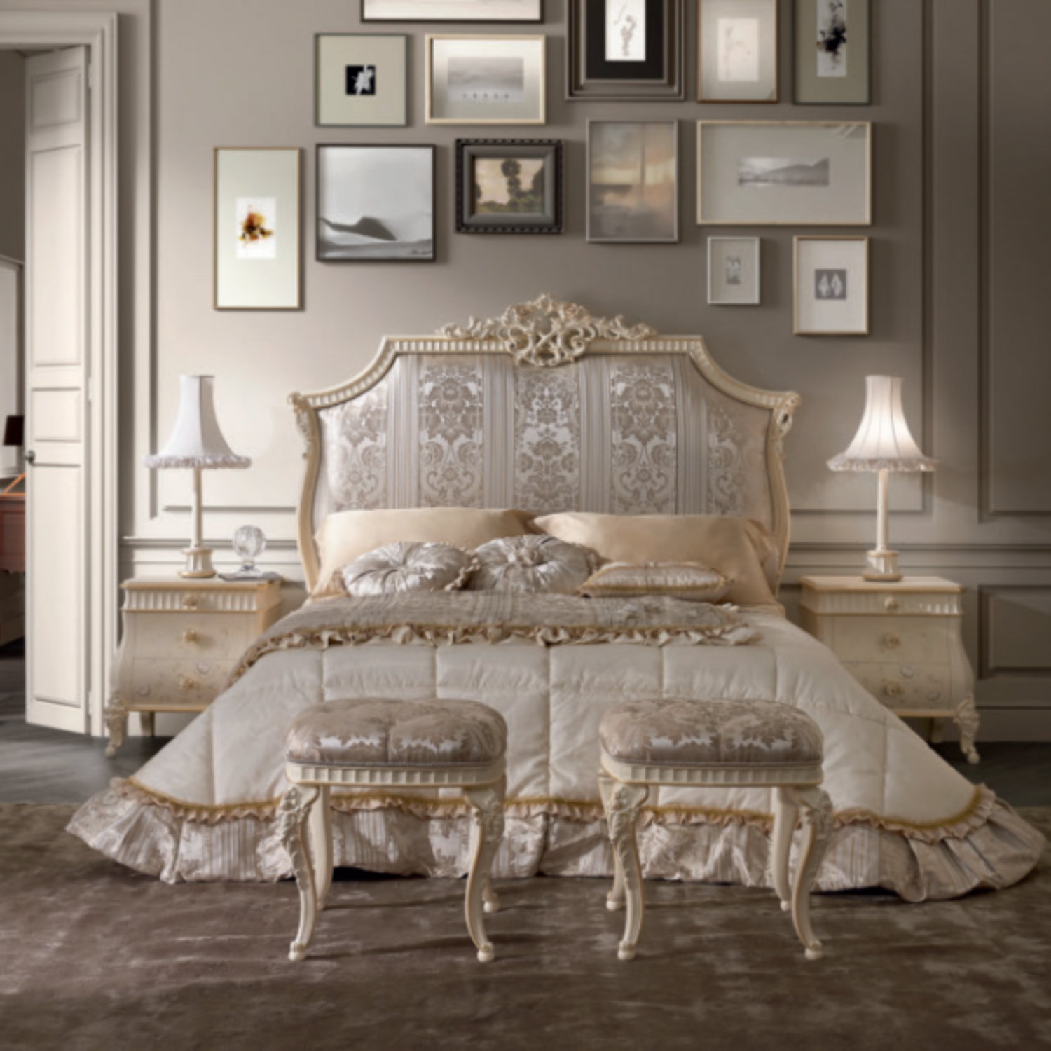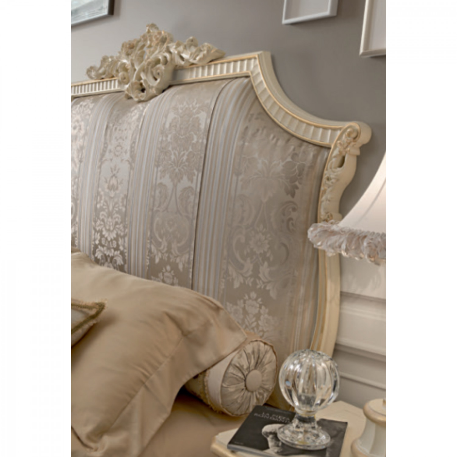 Bed with carved solid wood frame and fabric-upholstered panel.