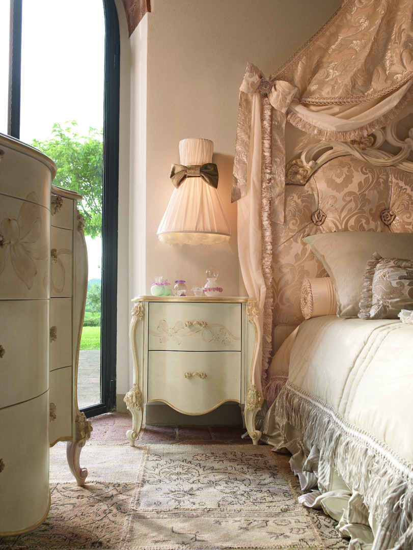 Bed with carved solid wood frame and fabric-upholstered panel. Available with crown.