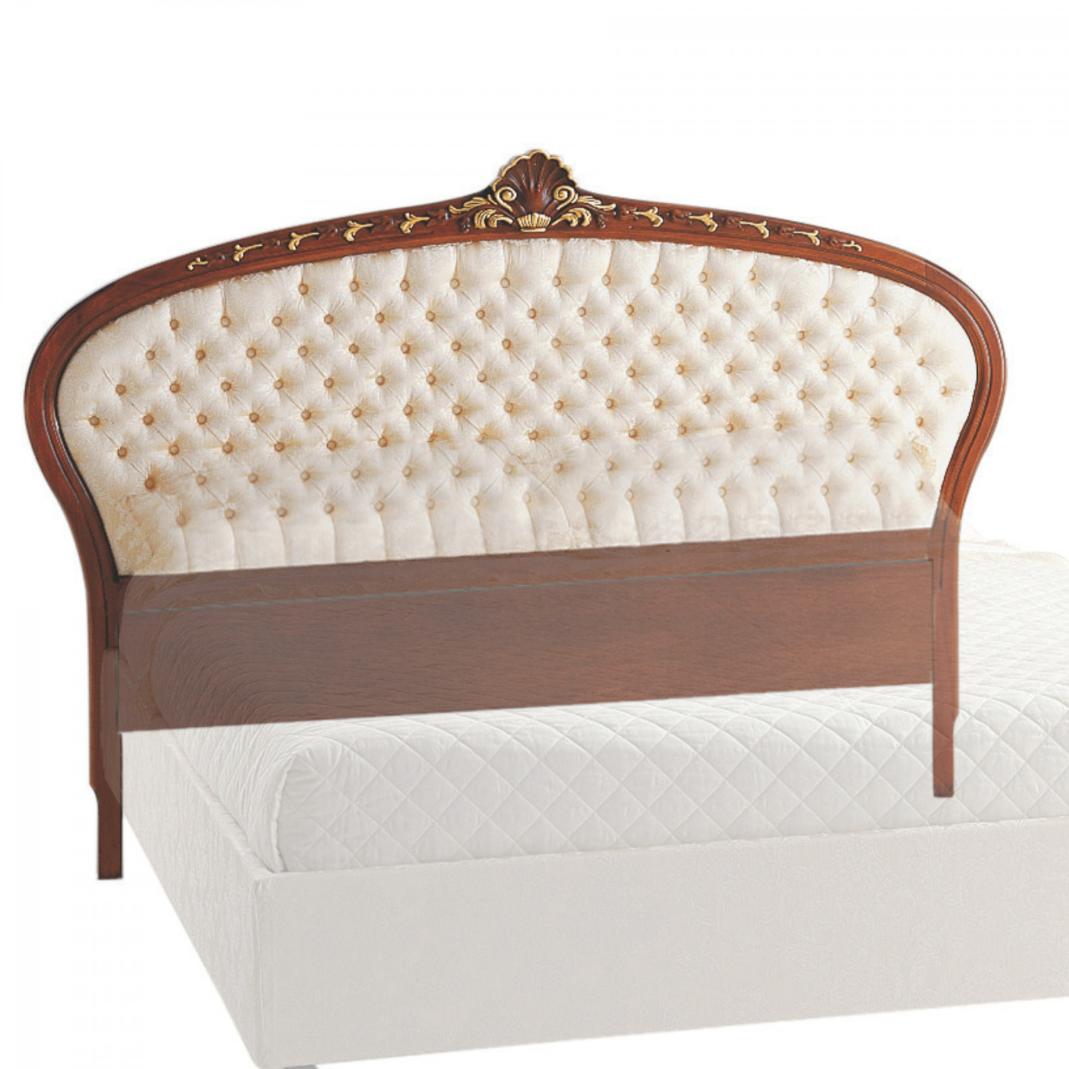 Bed with carved solid wood frame and fabric-upholstered panel.