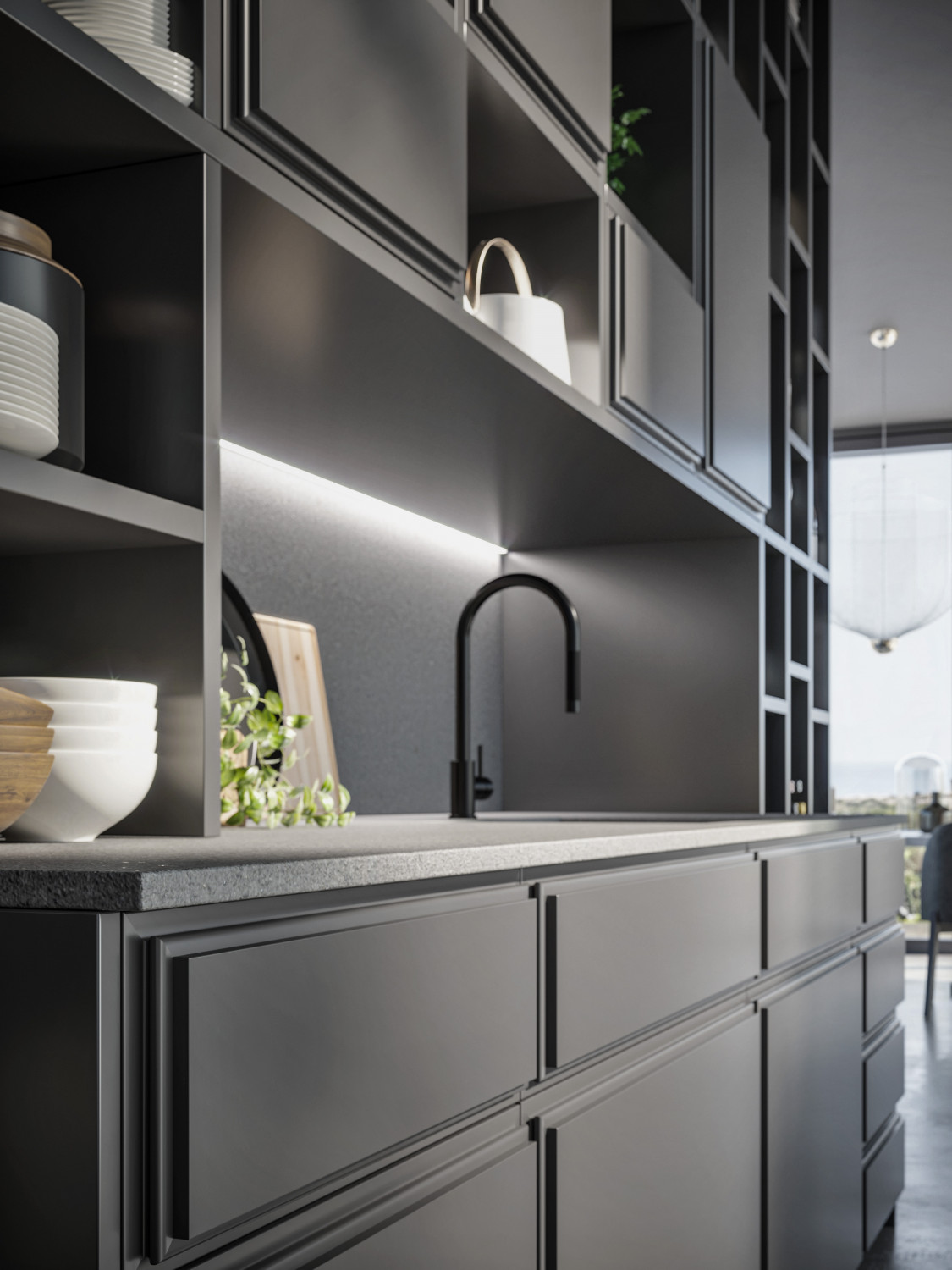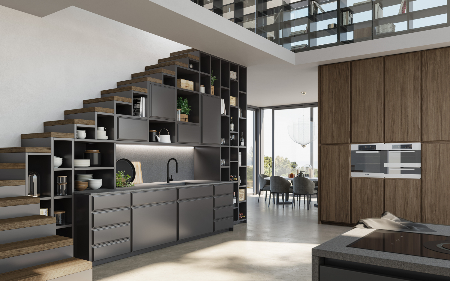 Cucina su misura in legno con ante e cassetti laccati Titanio 460. Ante delle colonne in finitura frassino tabacco.