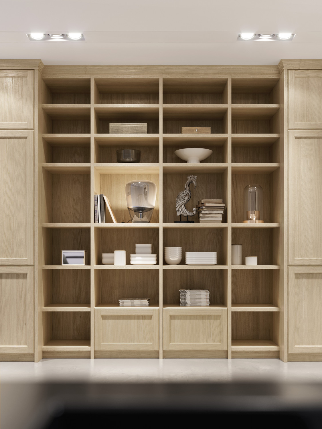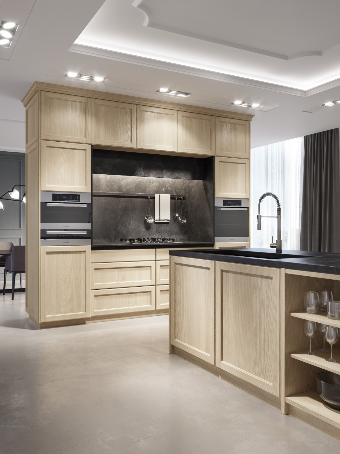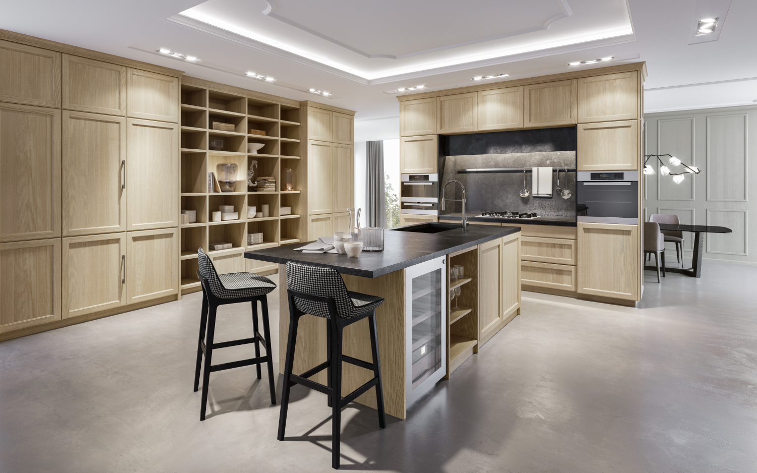 Cucina in legno massello e listellare in finitura frassino light, top e fondale in pietra ardesia.