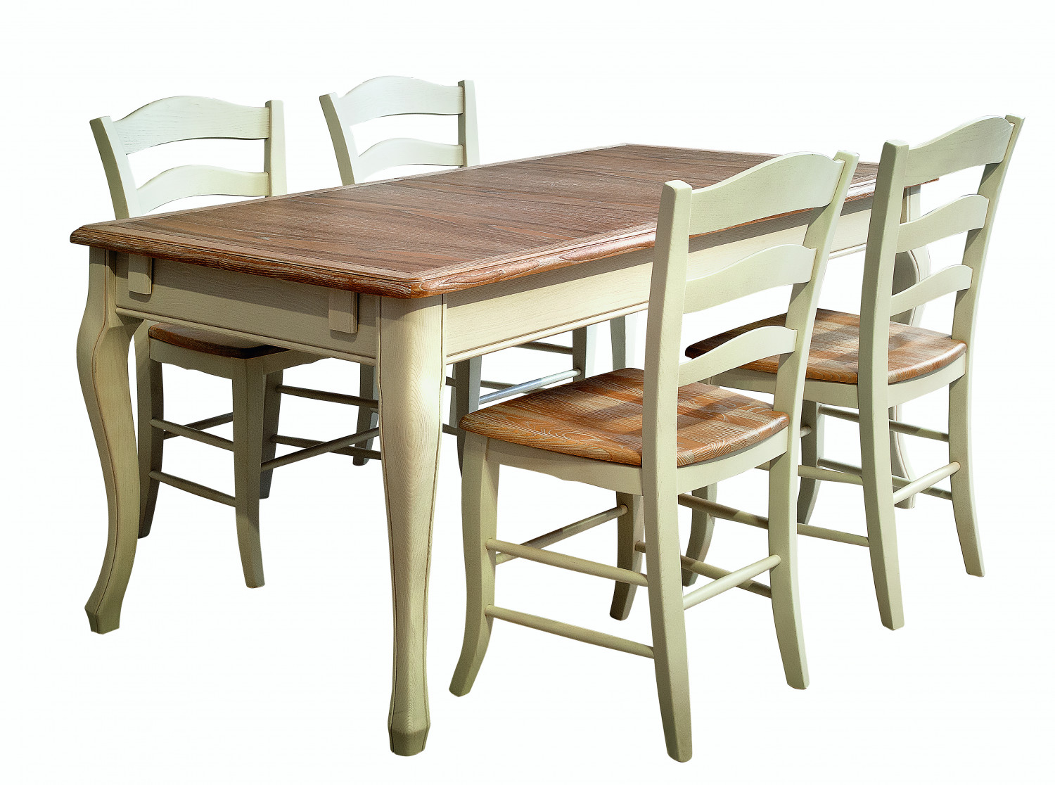 Tavolo in legno massello finemente lavorato con piano allungabile e fasce sagomate.
