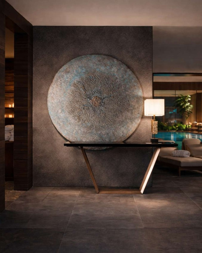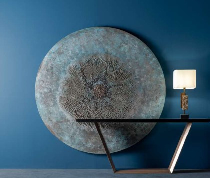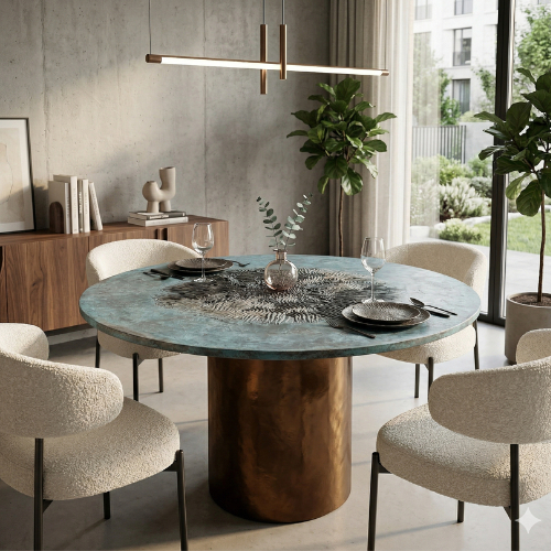 Tavolo da pranzo in legno con piano verniciato e lavorato a mano con finiture in metallo liquido. Customizzabile su richiesta