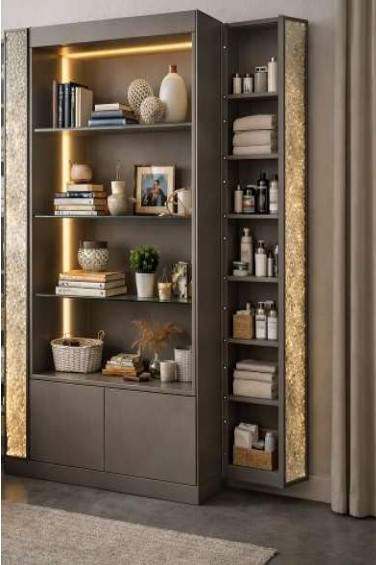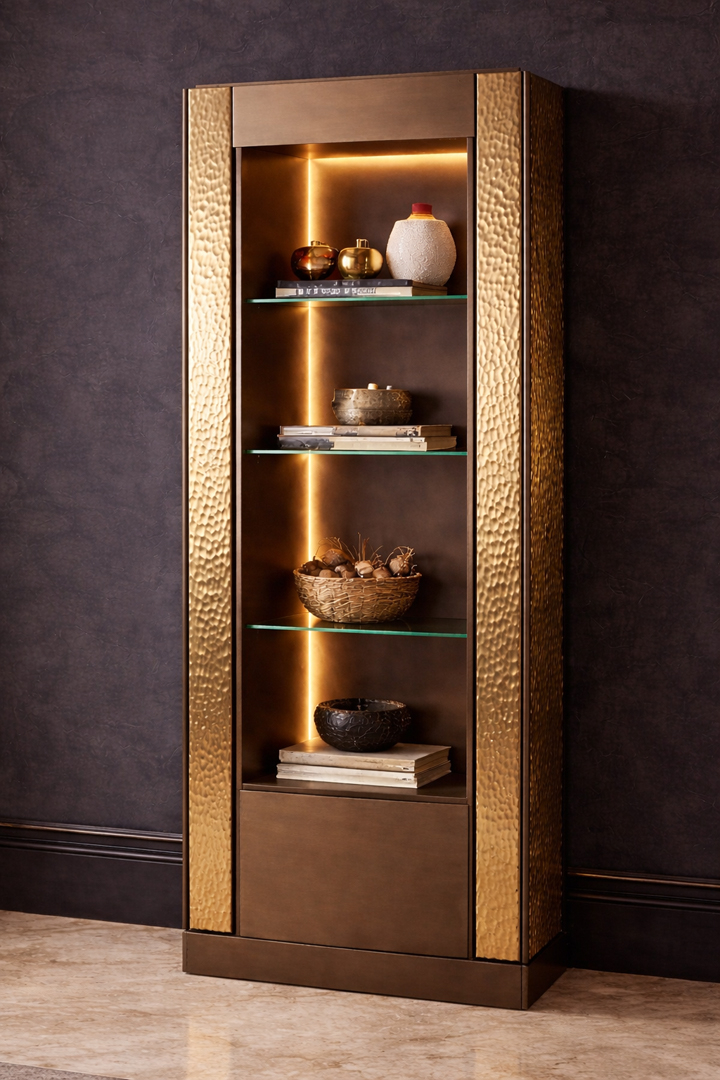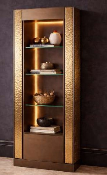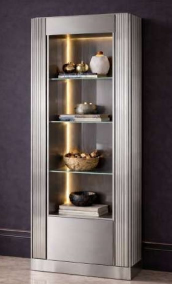 Mobile vetrina con colonna contenitore apribile lateralmente. Fasce laterali di decoro in vetro martellato. Disponibile con specchio e con illuminazione.