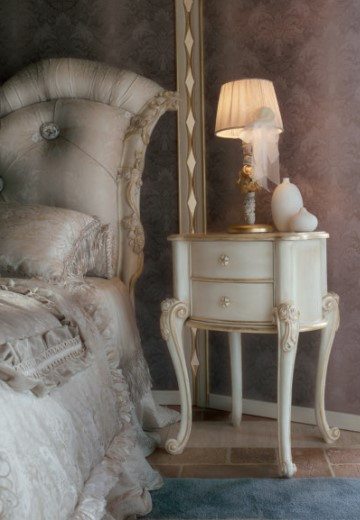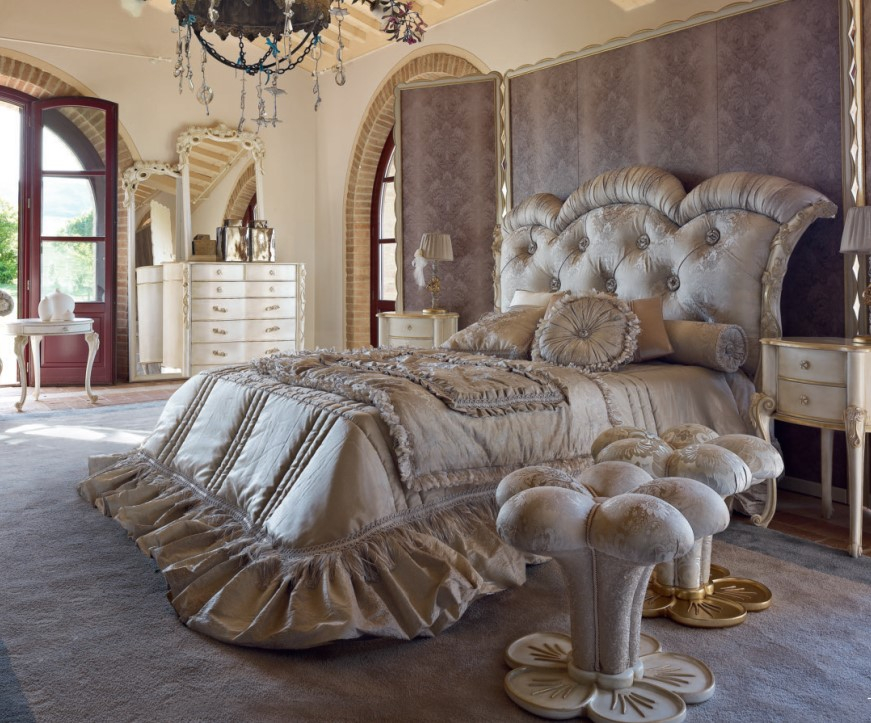 Letto con cornice intagliata in legno massello e pannello imbottito in tessuto.